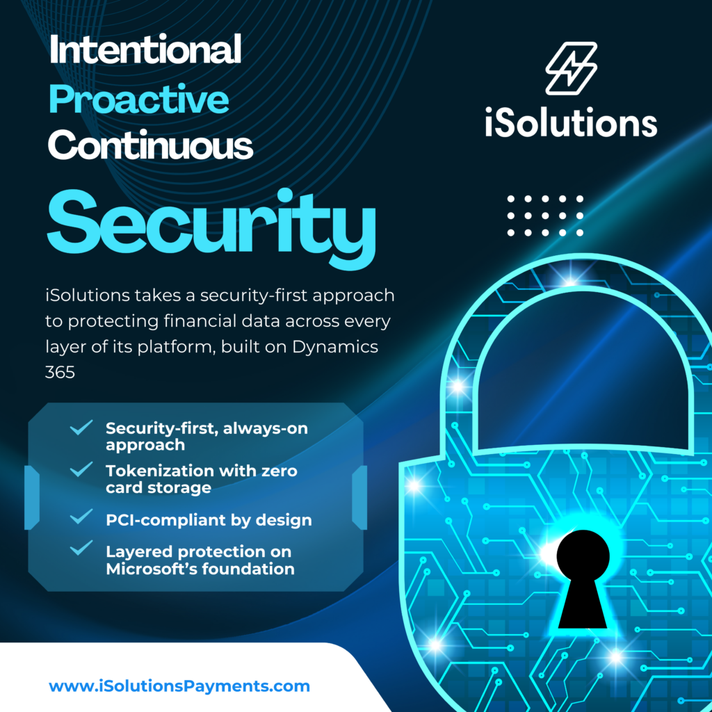 iSolutions does not store sensitive credit card data in our system or in our client’s Business Central environments. In fact, we don’t even have visibility into full cardholder data. When a customer enters their payment information, it is transmitted securely and directly to the payment processor. The only information returned is tokenized data, which represents the payment method without exposing any sensitive details. This approach significantly reduces risk and helps protect both your business and your customers.