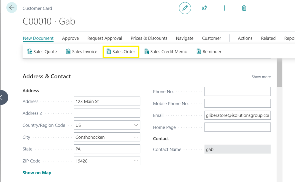 To start, open Microsoft Dynamics 365 Business Central and go to the customer record. From here, you can select “New Document,” followed by “Sales Order.”