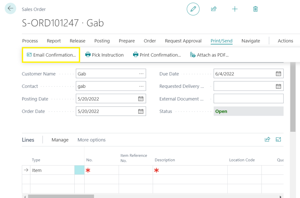 Next, add your line item(s) for the sales order and then click “Print/Send,” followed by “Email Confirmation.”