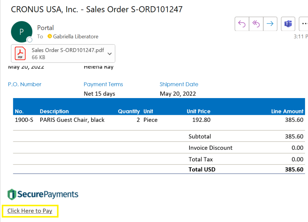 Next, you can go back to Business Central and open the sales order. If you scroll down, you will be able to see the authorized amount listed. This is also the time you can add any additional charges (shipping, freight, etc). After you have your sales order ready, click “Posting” and then “Post.” You can then open the posted invoice and see it was closed. Your customer will also receive a receipt letting them know that their payment was received.