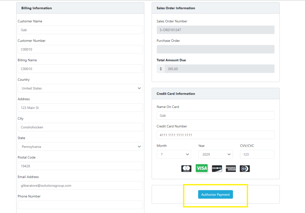 They will then be taken to the following page, where they can enter their credit card information securely. Once they do that, they will click “Authorize Payment.”